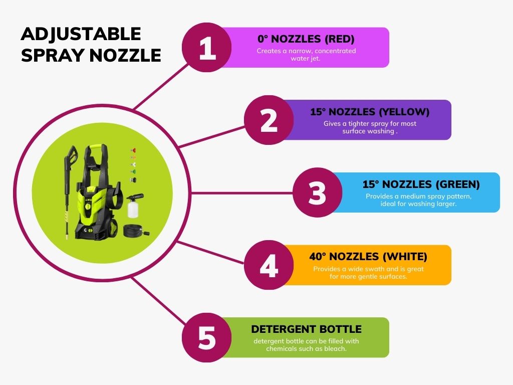 Adjustable Spray Nozzle: The power washer comes equipped with four quick-connect metal spray nozzles (water pressure strength: 0°, 15°, 25°, 40°) and a foam cannon for versatile cleaning options.